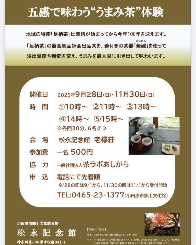 2025.11.15 お知らせ 松永記念館老欅荘体験会 お庭が美しい松永記念館老欅荘での体験会です。11月30日の参加受付が始まっています。 え?これがお茶? 品評会出品の最高級茶の持つ魅力を五感でじっくり味わってみてください。 お問い合わせはこちらから…お問い合わせ Post Share Hatena Pocket RSS feedly Pin it 夜活!お茶淹れ勉強会 前の記事